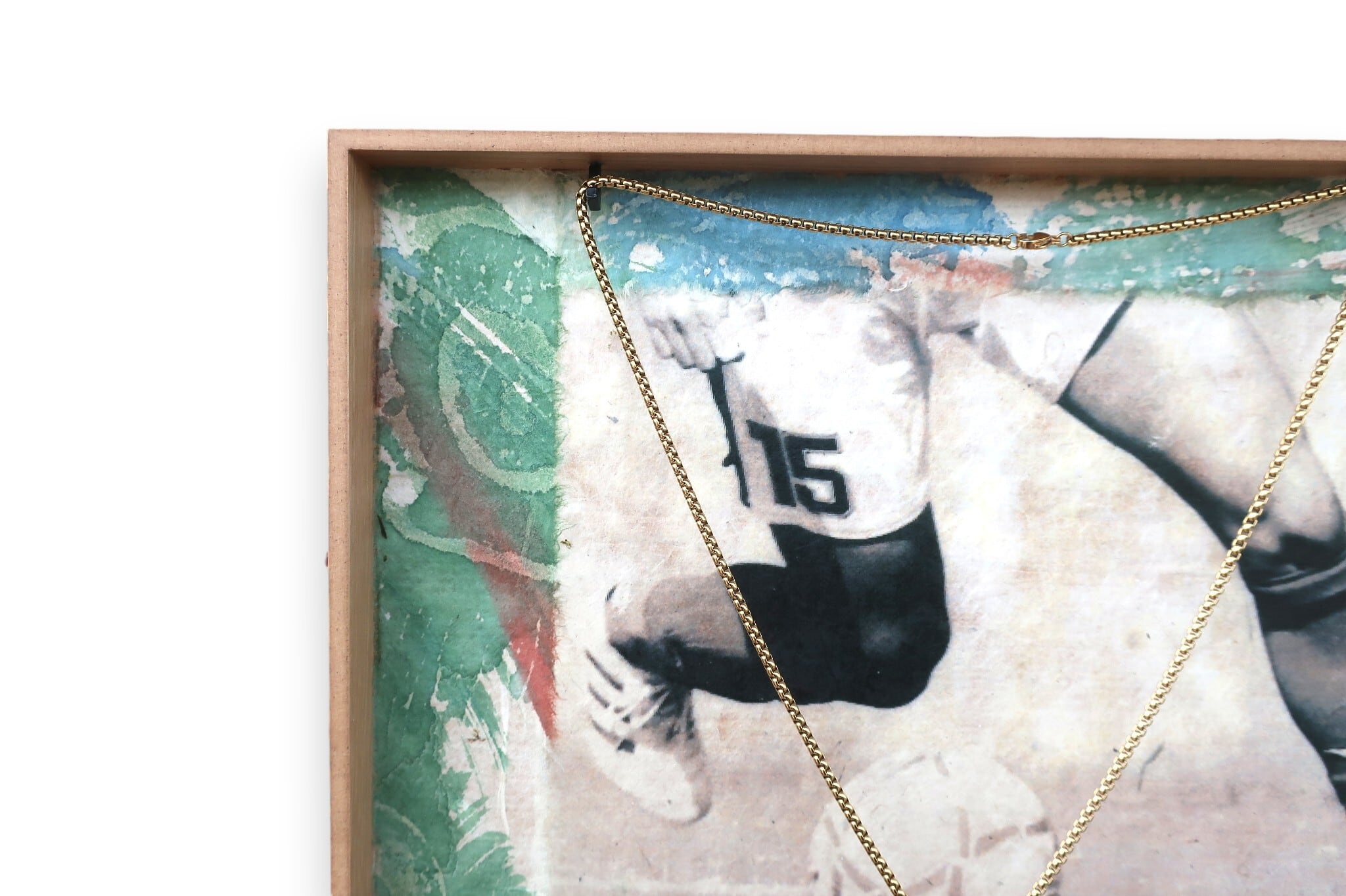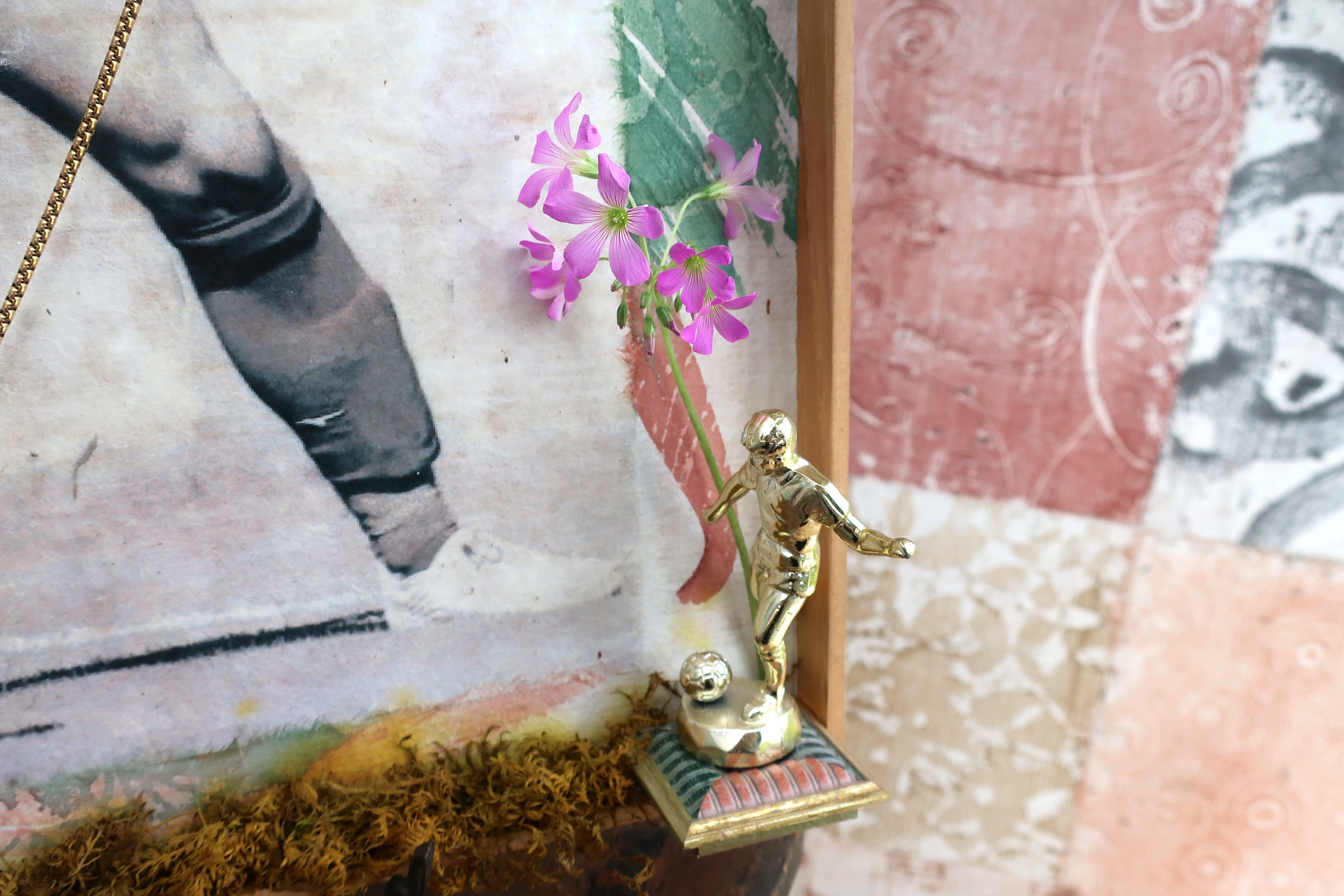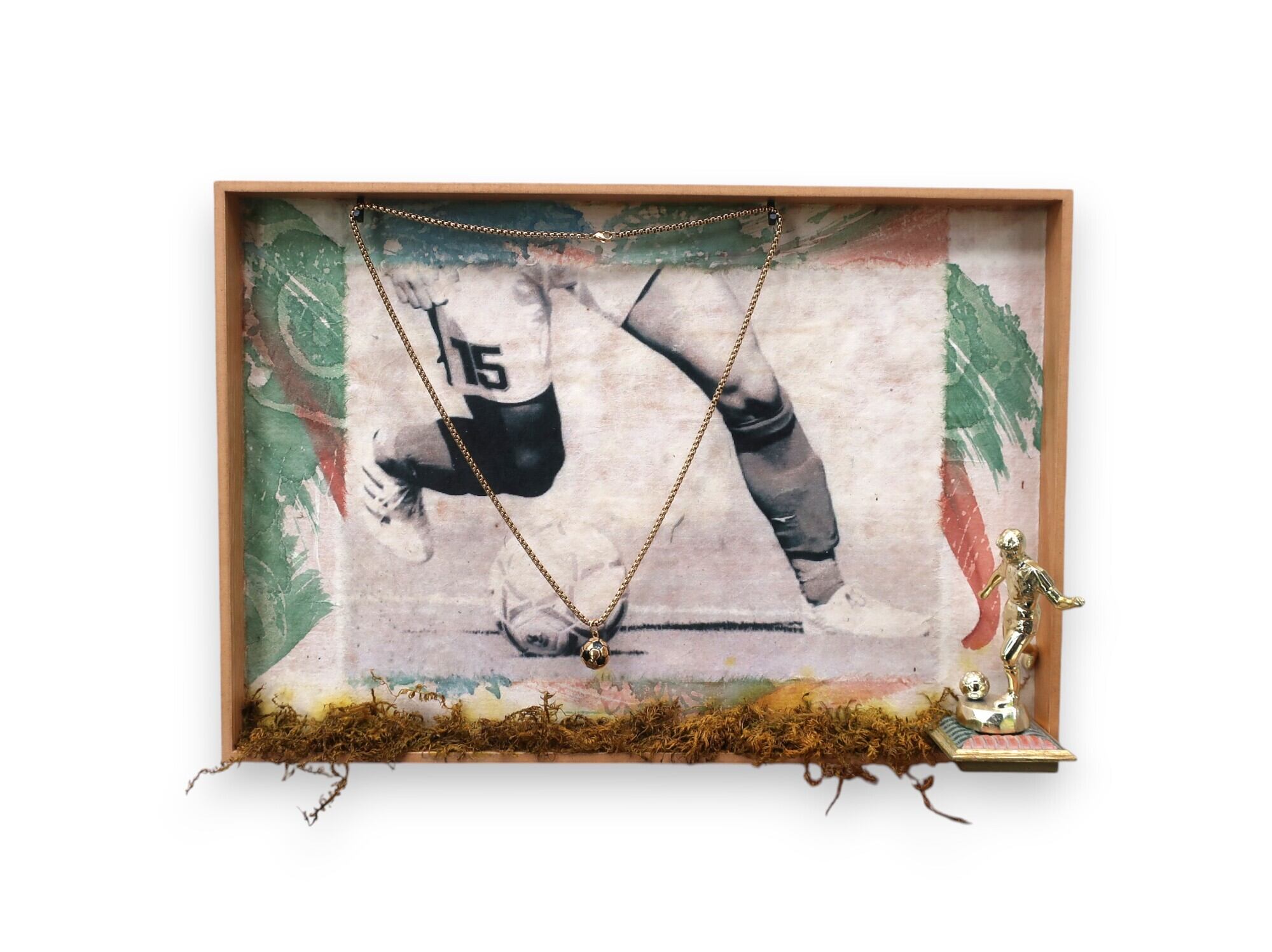 サッカーモチーフの壁掛け作品。染描紙(※)の温かな雰囲気とパステルカラーで爽やかな青春も感じられます。ゴールドペンダントを掛けた作品ですが、ここにメダルをかけて飾っても素敵ですよね!他にはないメダル飾りになりますね!