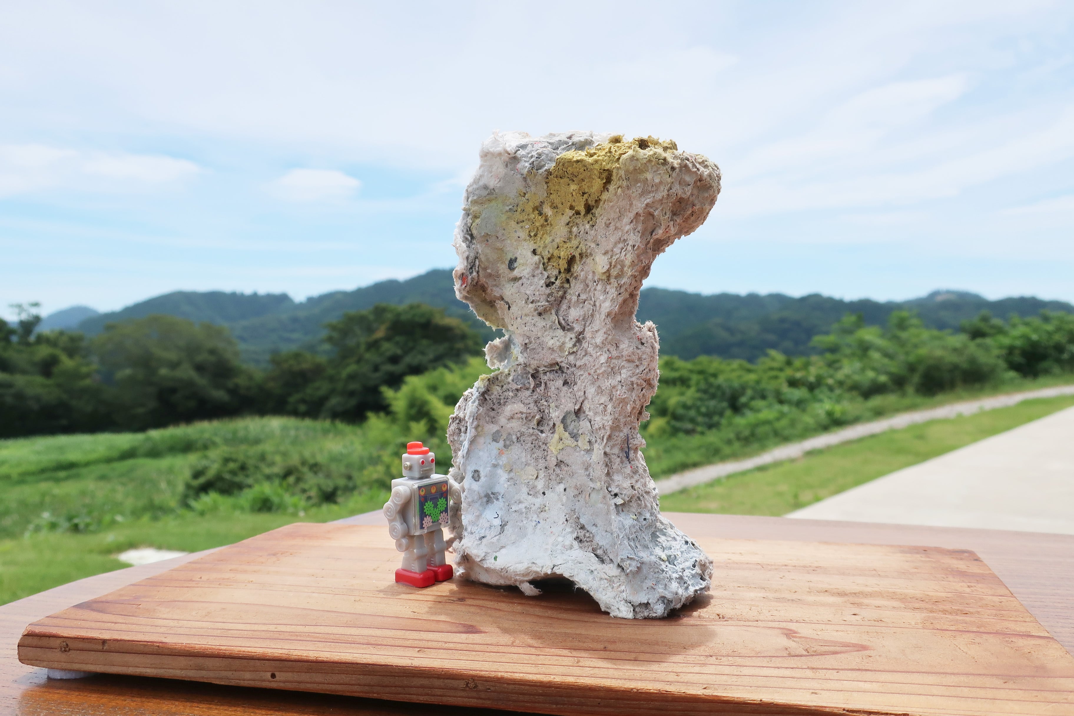 榎本大翔さん(https://www.instagram.com/enomotodaisuke/)の幼少期から紙に残してきたメモや落書き絵などを利用し作られた立体物“紙藝”。