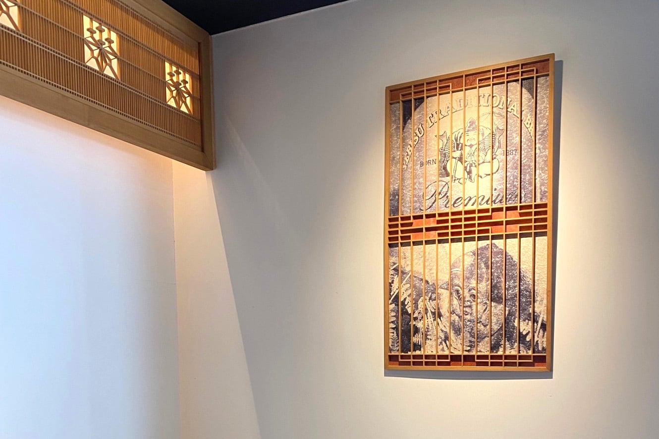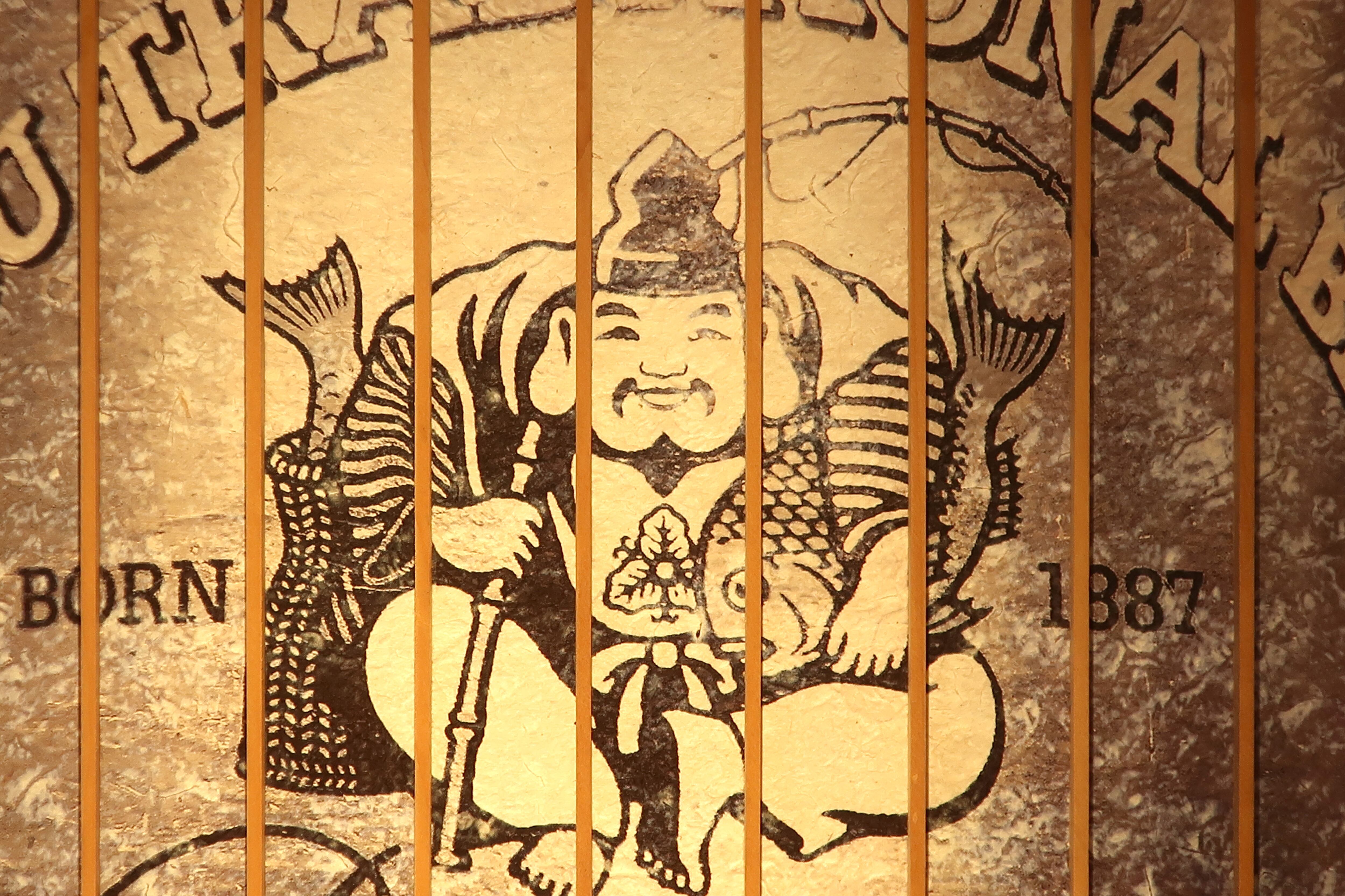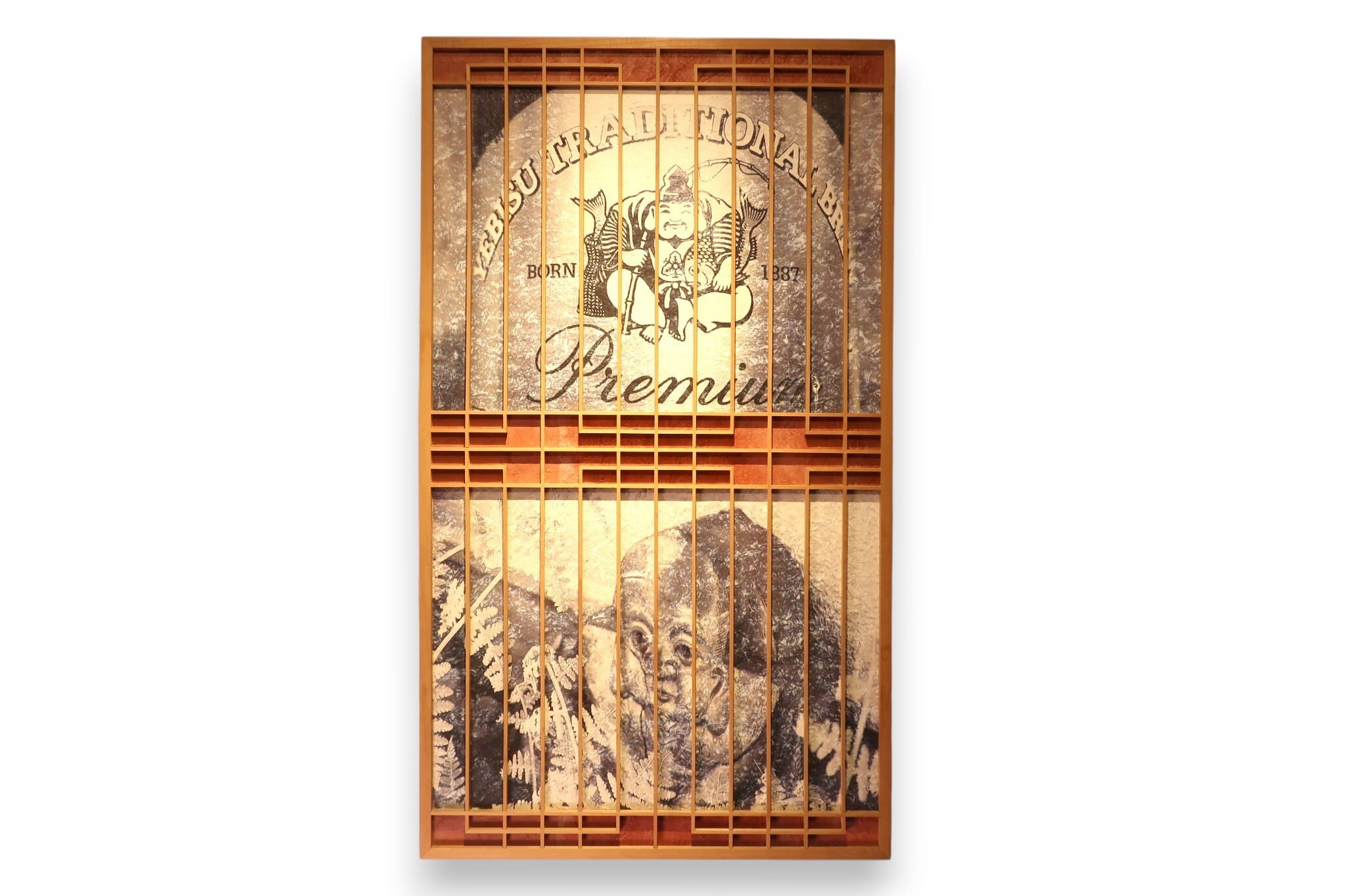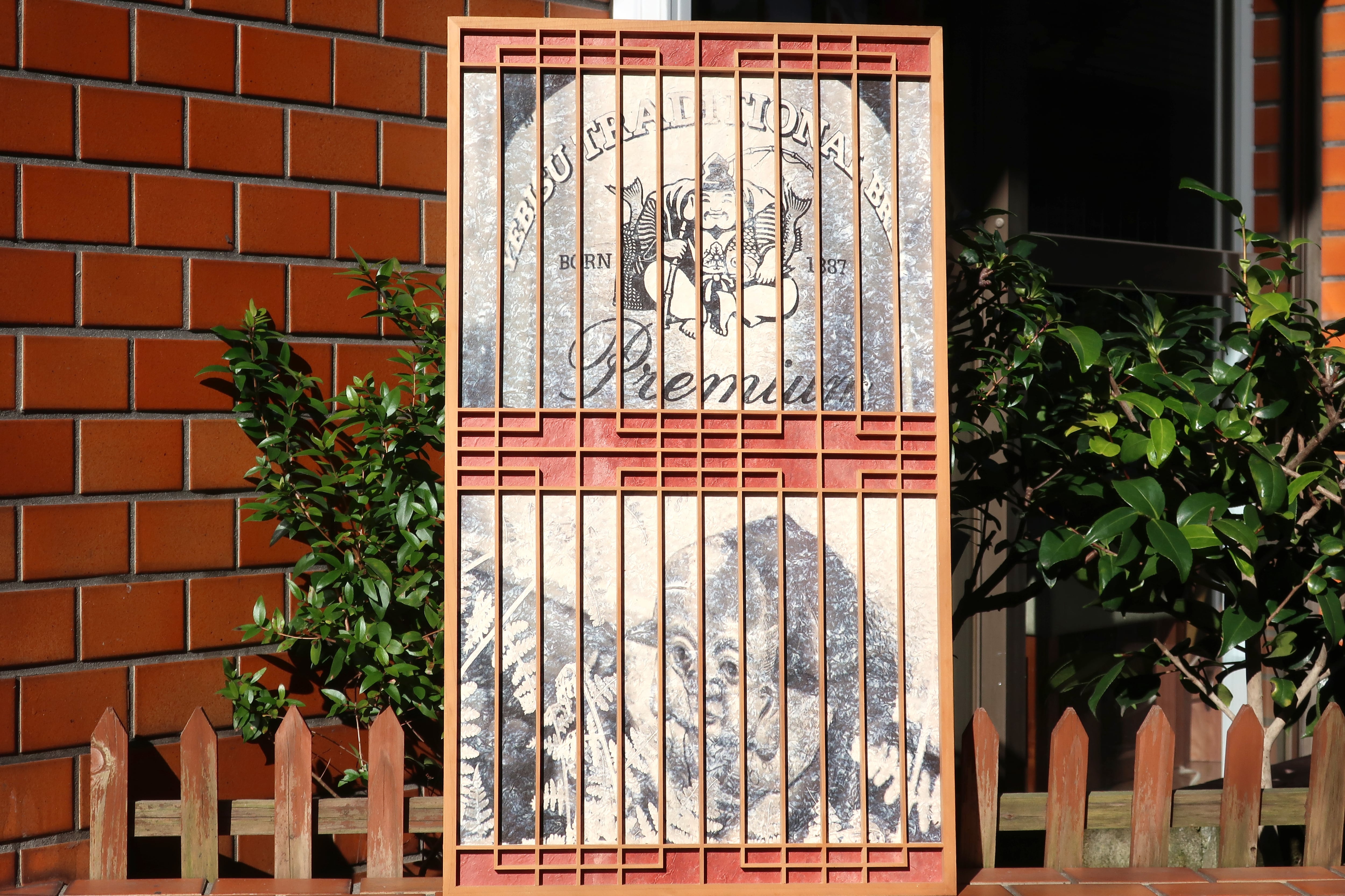 メッセージ:よーく見てくださいYEBISUBEER鯛2匹!そして瓦福助!何か越しに見るとその風景がガラッと変わることがあります。組子越しに見るハッピーアイテム如何ですか。